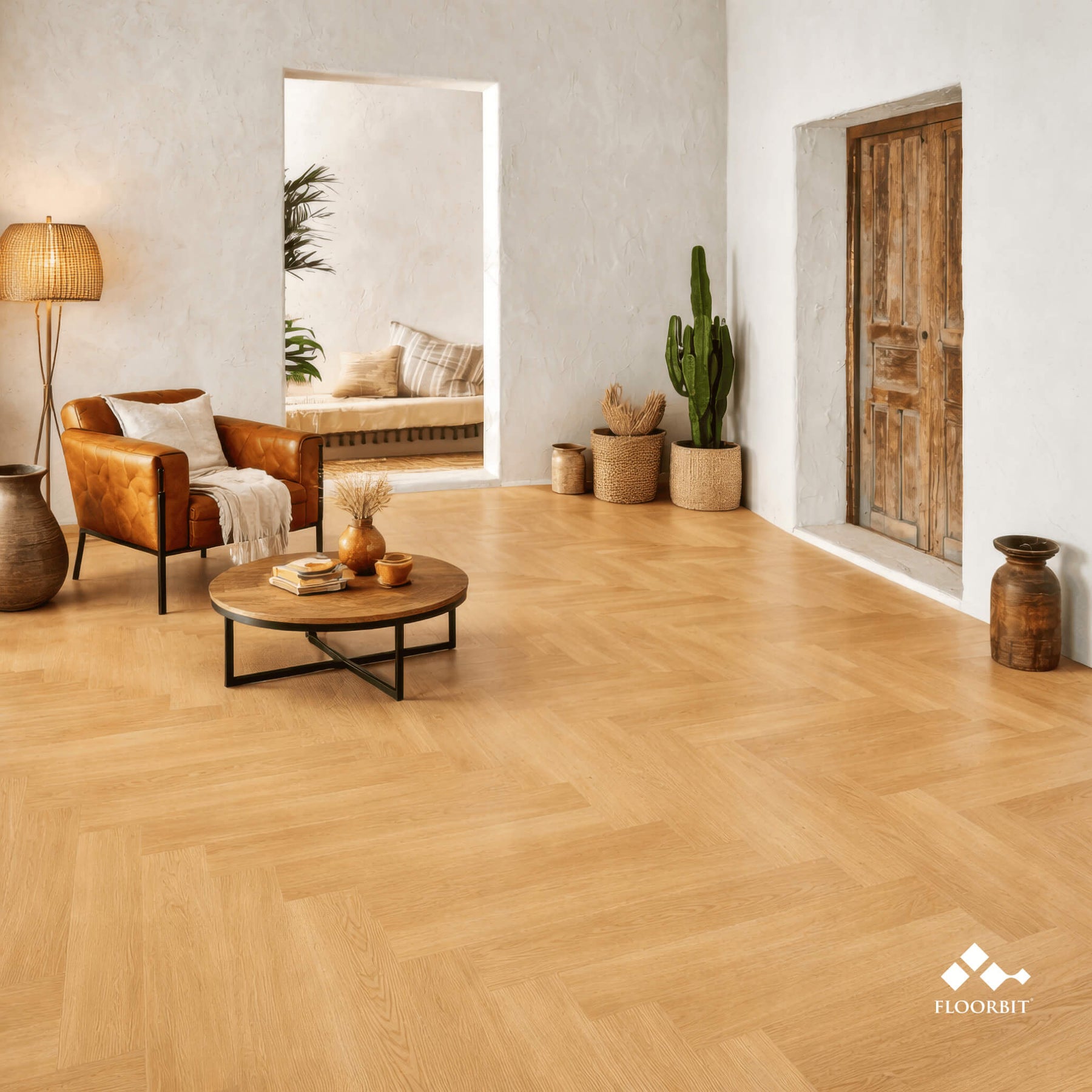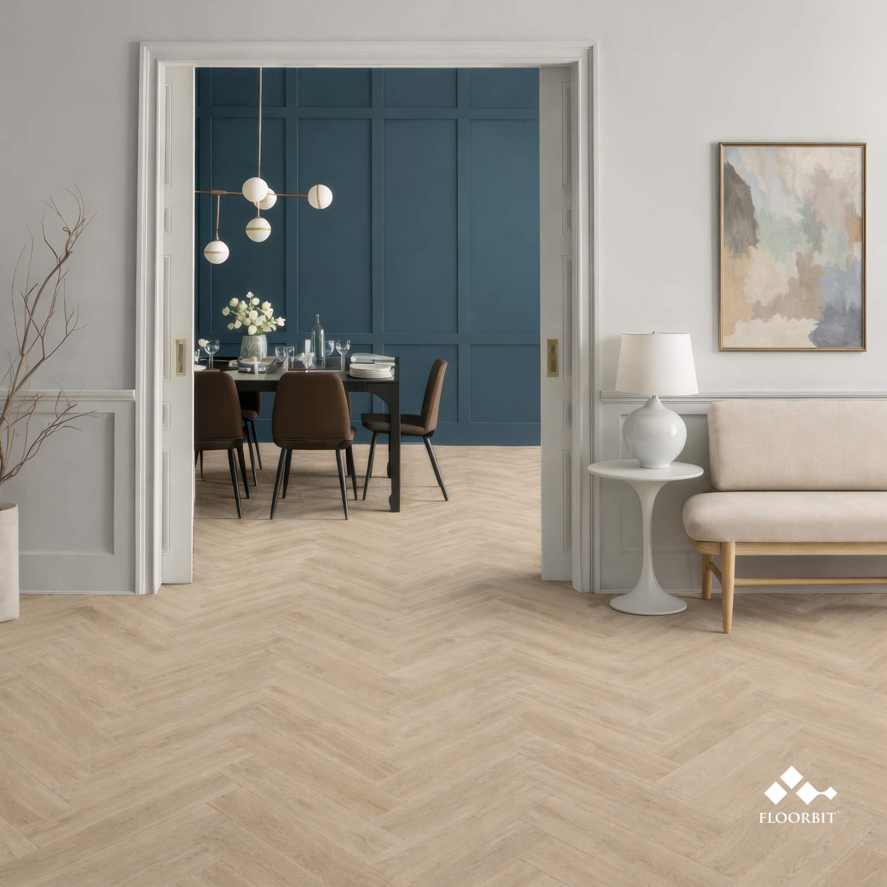 Waterblock Pro 12.6mm Herringbone is not fixed to the subfloor but installed on top of it. This allows the wood material to have enough space to expand or contract depending on the temperature and humidity. Floating installation is a simple way of installing flooring. It is also easy to remove again.